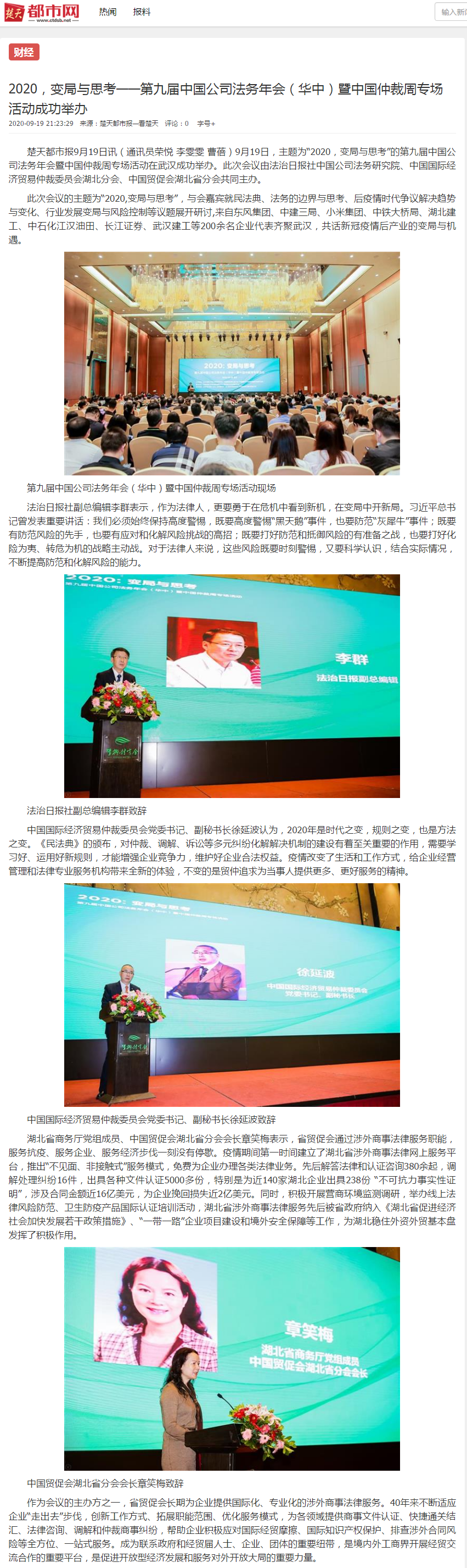 楚天都市报:2020,变局与思考——第九届中国公司法务年会(华中)暨中国仲裁周专场活动成功举办