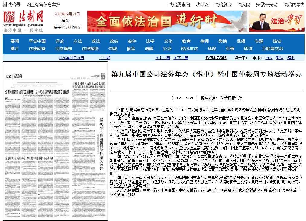 法治日报:第九届中国公司法务年会(华中)暨中国仲裁周专场活动举办