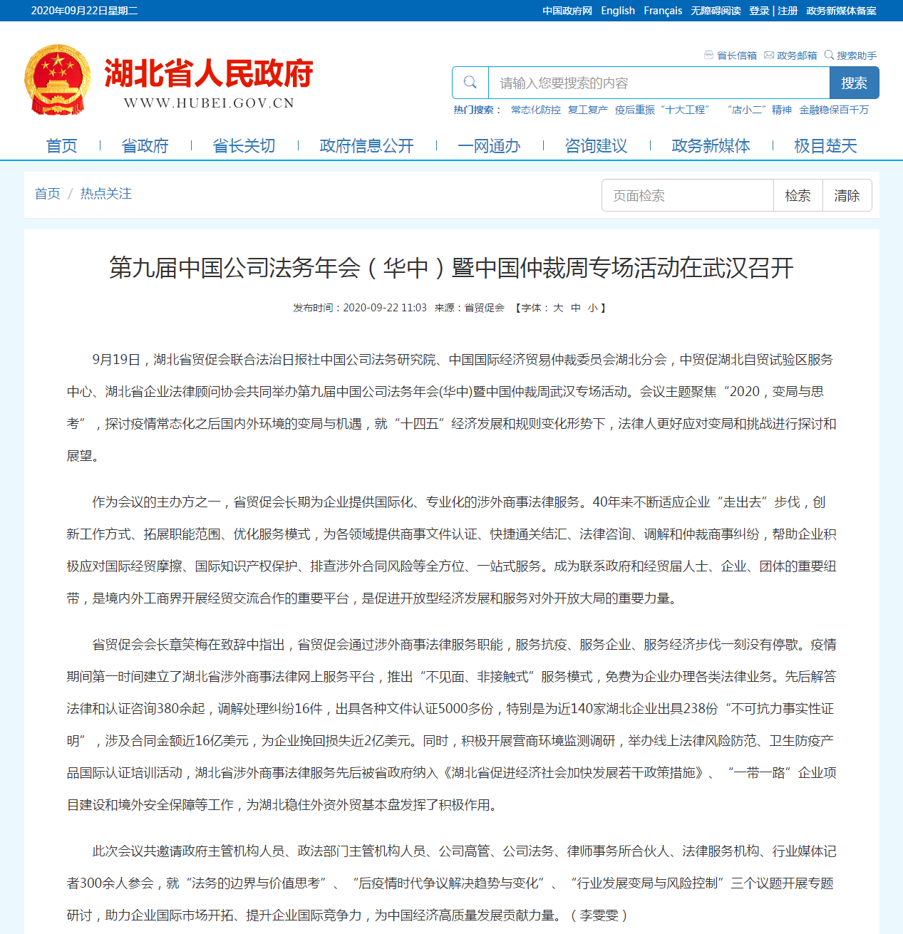 省政府门户网:第九届中国公司法务年会(华中)暨中国仲裁周专场活动在武汉召开