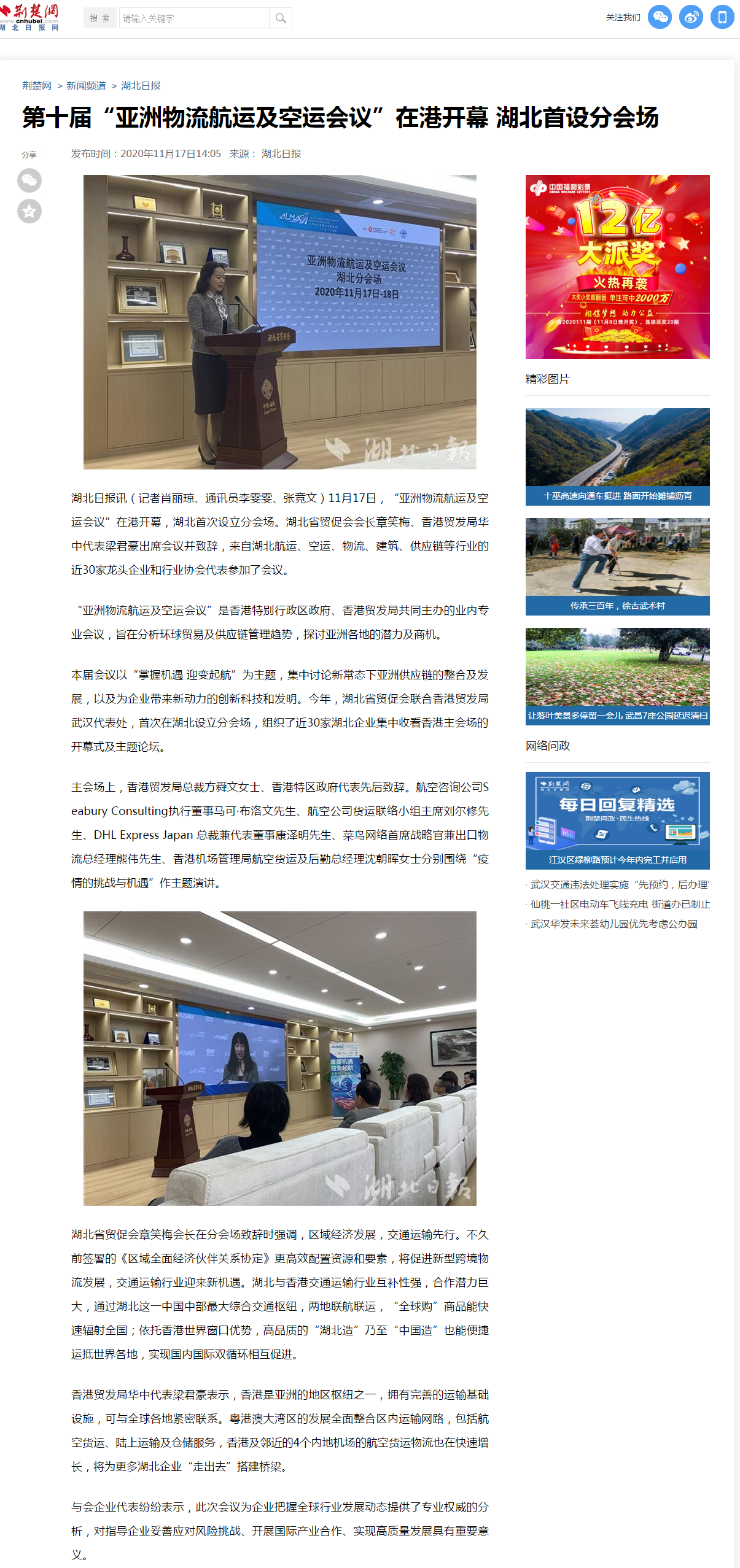 荆楚网:第十届“亚洲物流航运及空运会议”在港开幕 湖北首设分会场