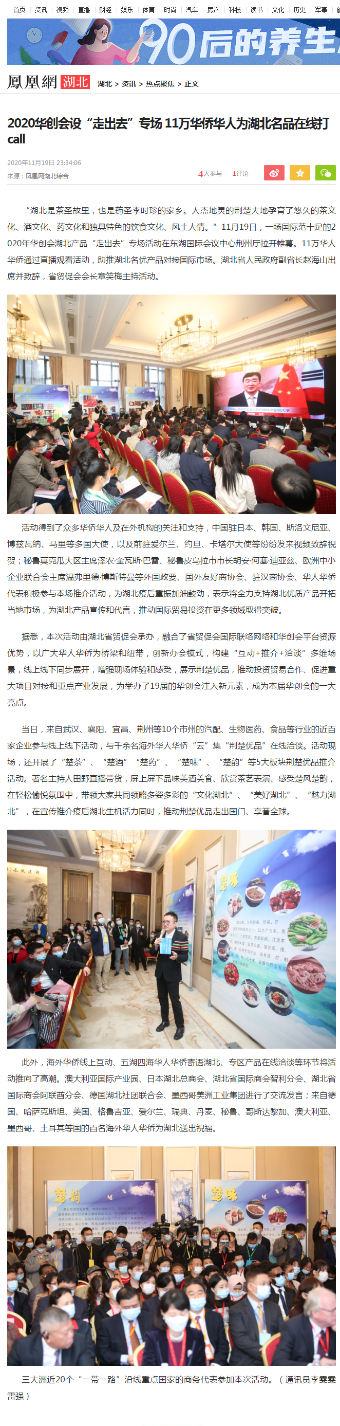 凤凰网:2020华创会设“走出去”专场 11万华侨华人为湖北名品在线打call