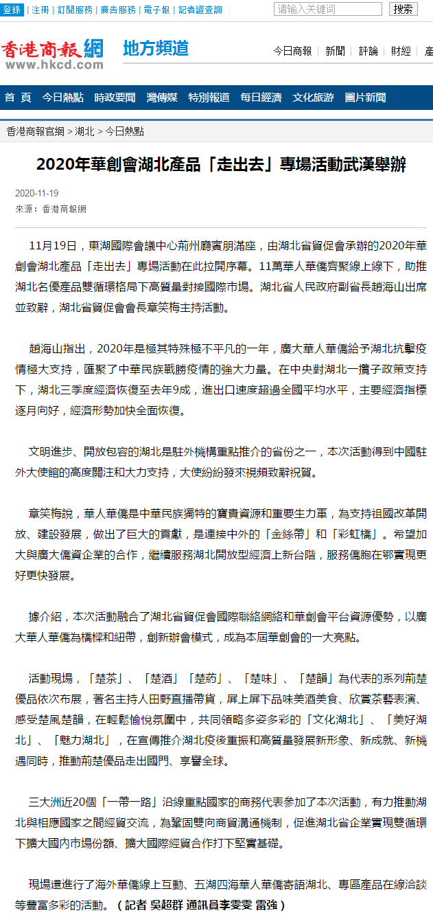 香港商报:2020年华创会湖北产品“走出去”专场活动武汉举办