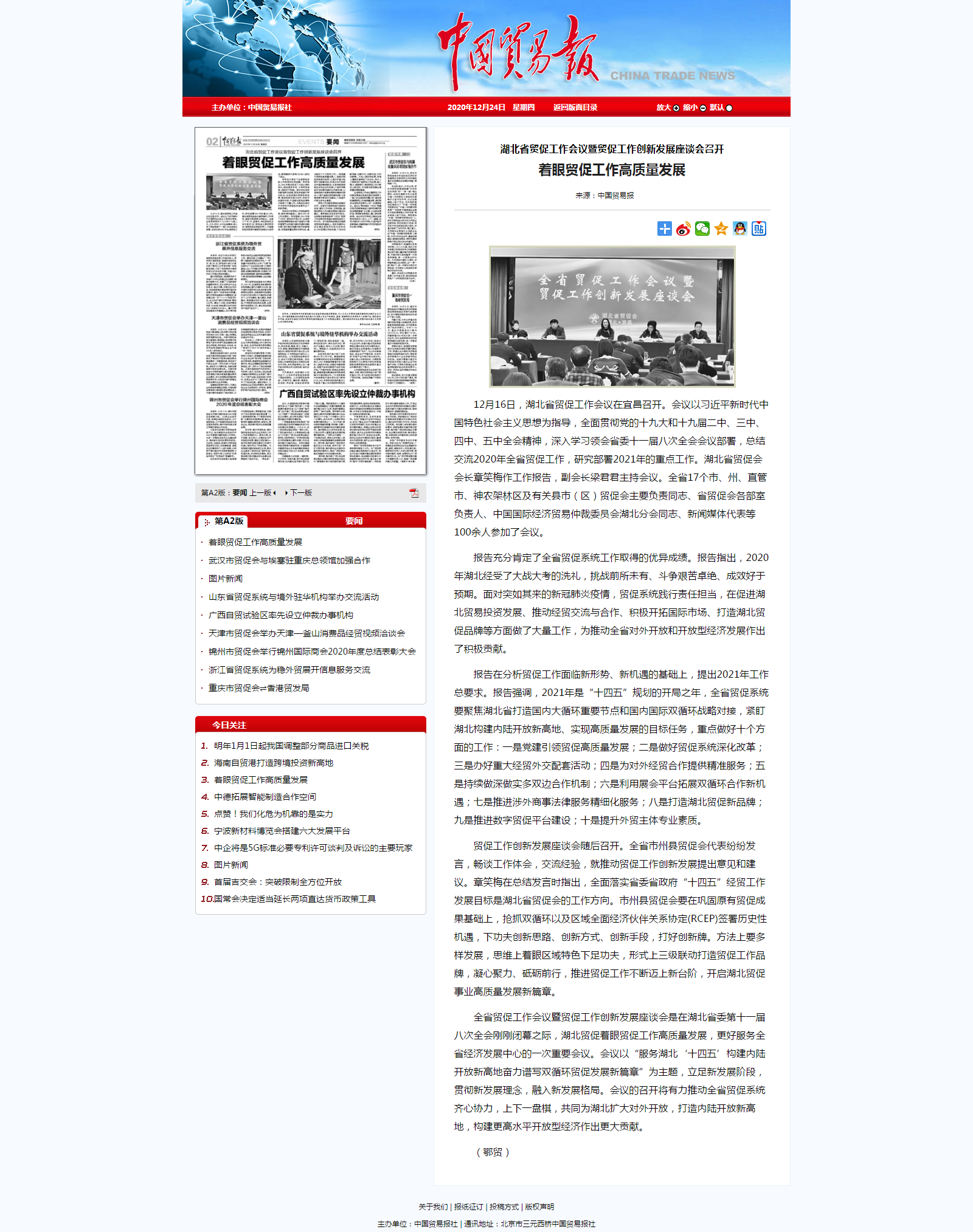 中国贸易报:湖北省贸促工作会议暨贸促工作创新发展座谈会召开 着眼贸促工作高质量发展