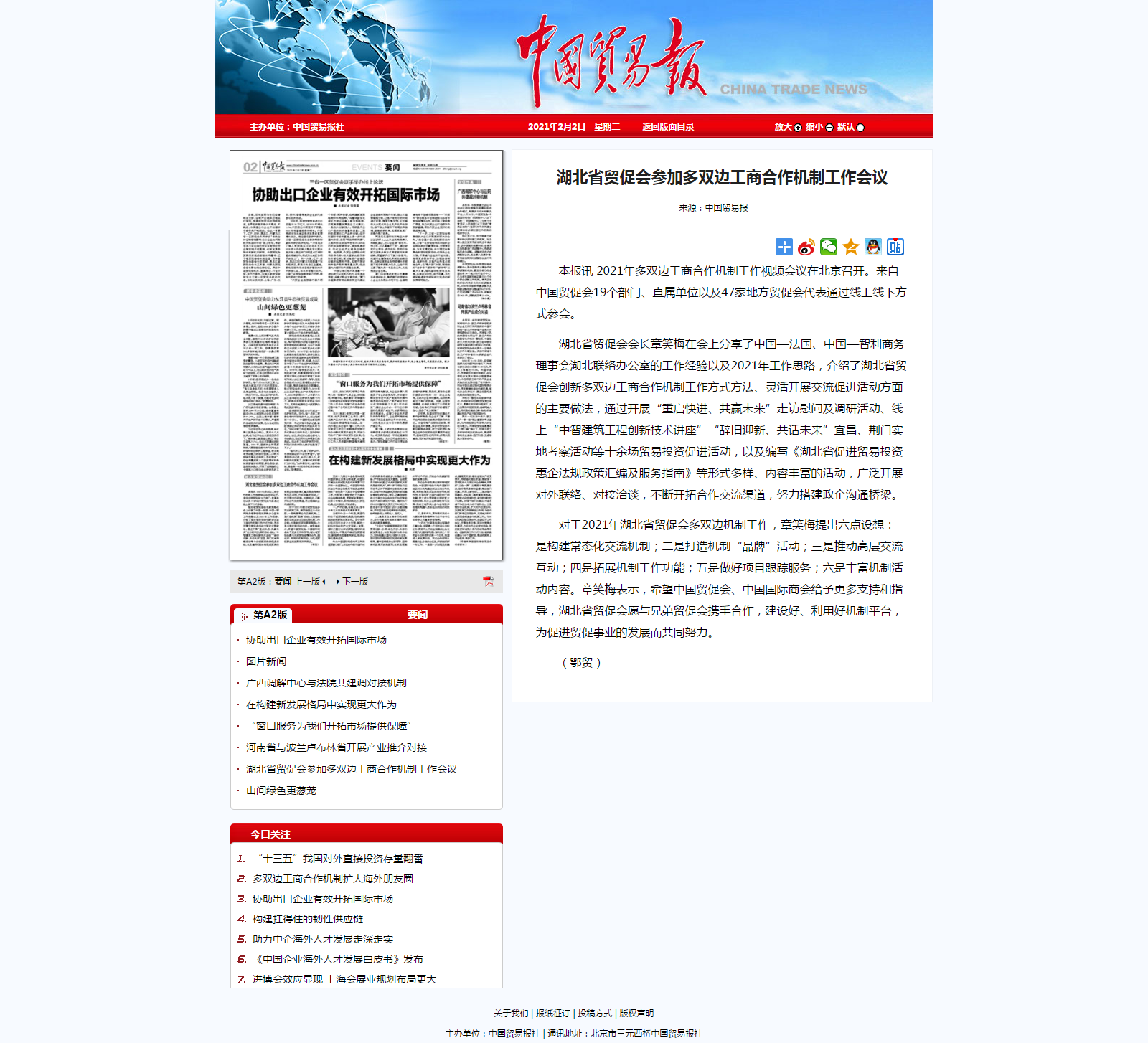 中国贸易报:湖北省贸促会参加多双边工商合作机制工作会议