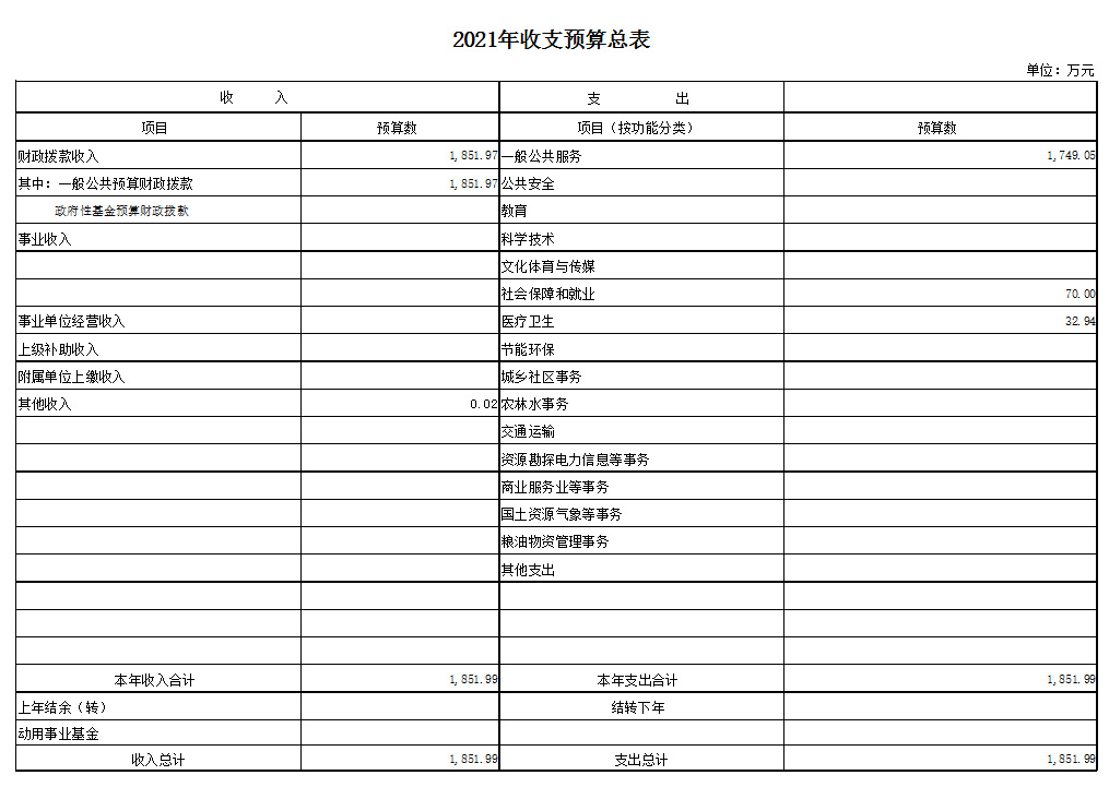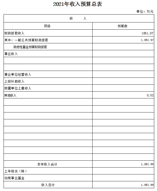 2021年收入预算数1851.99万元,其中:财政拨款收入1851.97万元,其他收入0.02万元。