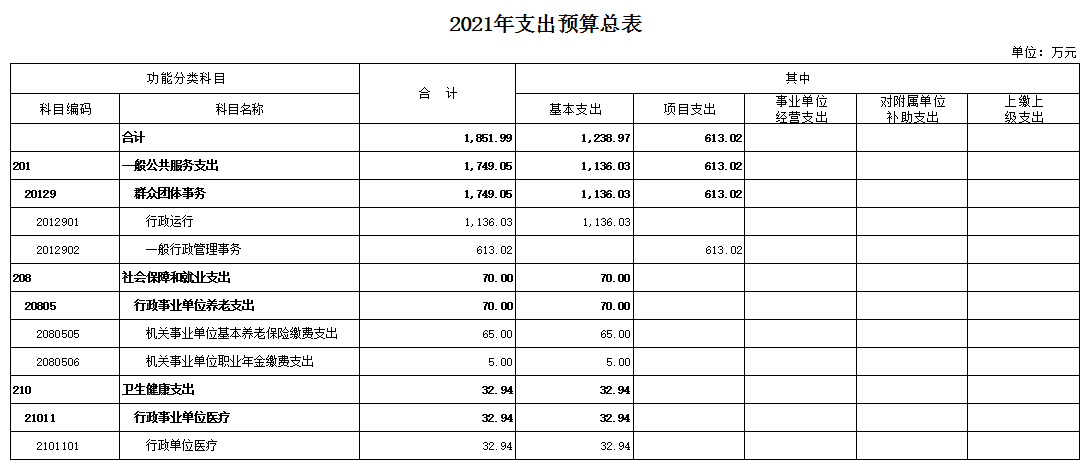 2021年我会支出预算数1851.99万元,其中:基本支出1238.97万元,项目支出613.02万元。