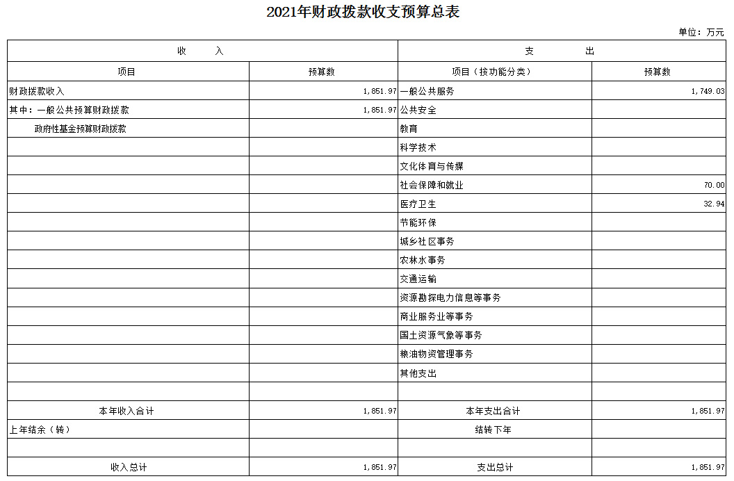 财政拨款支出预算数1851.97万元,其中:一般公共服务1749.03万元,社会保障和就业70万元,医疗卫生32.94万元。