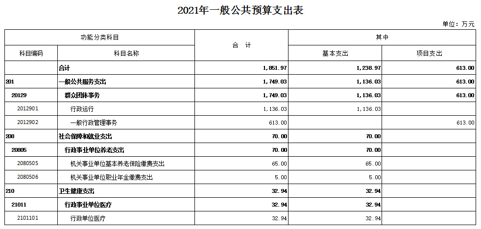 2021年我会一般公共预算支出预算数1851.97万元,其中:基本支出1238.97万元,项目支出613万元。
