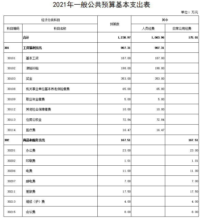 2021年我会一般公共预算基本支出预算数1238.97万元,其中:人员经费1063.96万元,日常公用经费175.01万元。