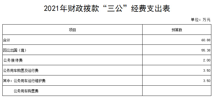 2021年我会财政拨款“三公”经费支出预算数60.88万元,其中:因公出国(境)费55.38万元,公务接待费2万元,公务用车购置及运行费3.5万元(公务用车运行维护费3.5万元、公务用车购置费为零)。较上年分别减少54.46万元、13.5万元、1.5万元。主要原因为受新冠肺炎疫情影响,因公出国(境)及外宾接待减少,以及落实过“紧日子”要求,整体压减“三公”经费支出。