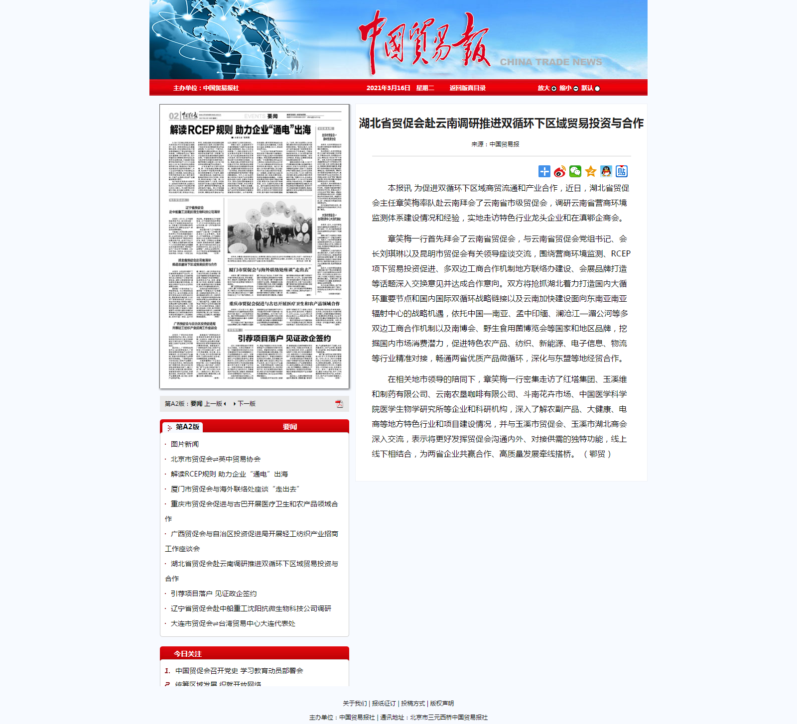 中国贸易报:湖北省贸促会赴云南调研推进双循环下区域贸易投资与合作