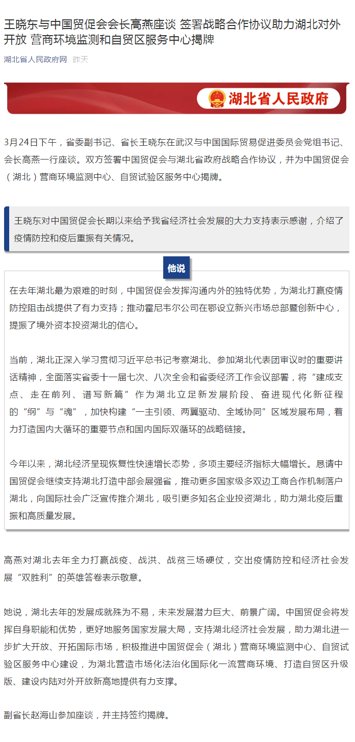 湖北省人民政府网:王晓东与中国贸促会会长高燕座谈 签署战略合作协议助力湖北对外开放 营商环境监测和自贸区服务中心揭牌