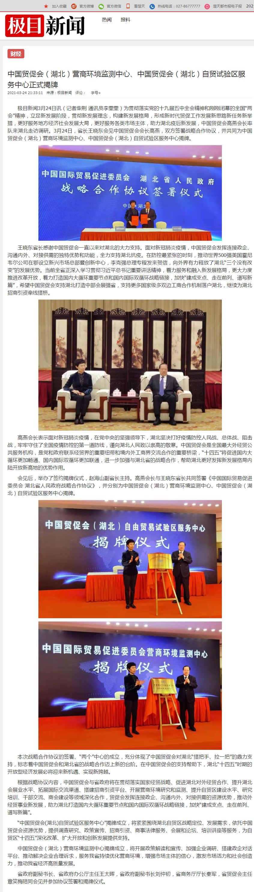 楚天都市报:中国贸促会(湖北)营商环境监测中心、中国贸促会(湖北)自贸试验区服务中心正式揭牌