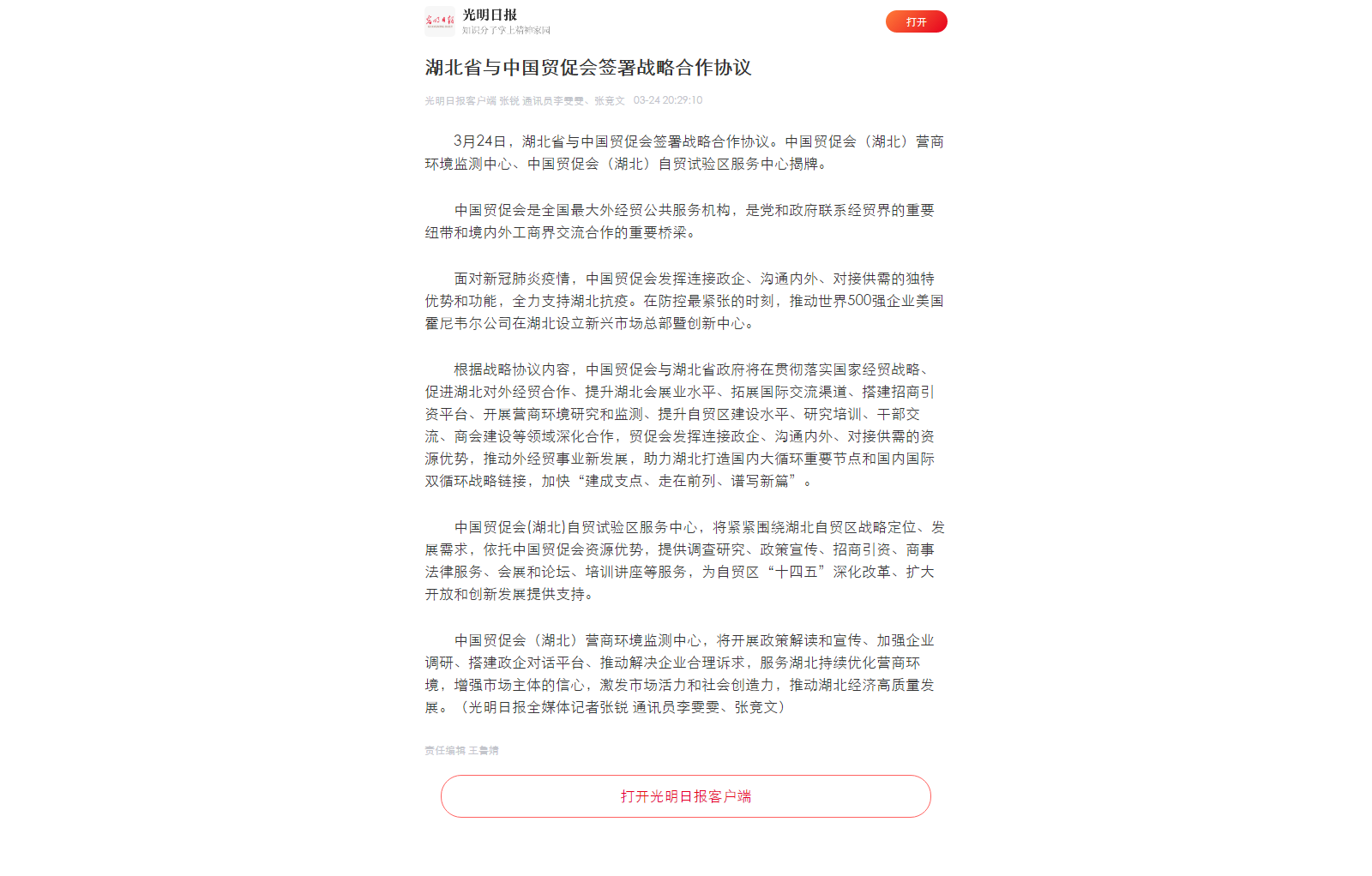 光明日报:湖北省与中国贸促会签署战略合作协议