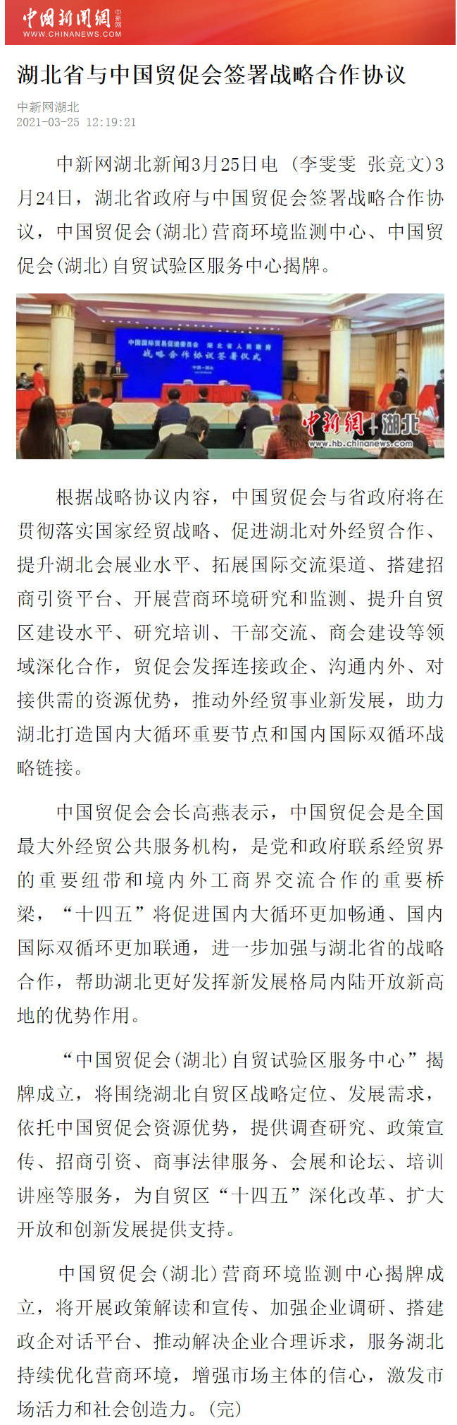 中国新闻网:湖北省与中国贸促会签署战略合作协议