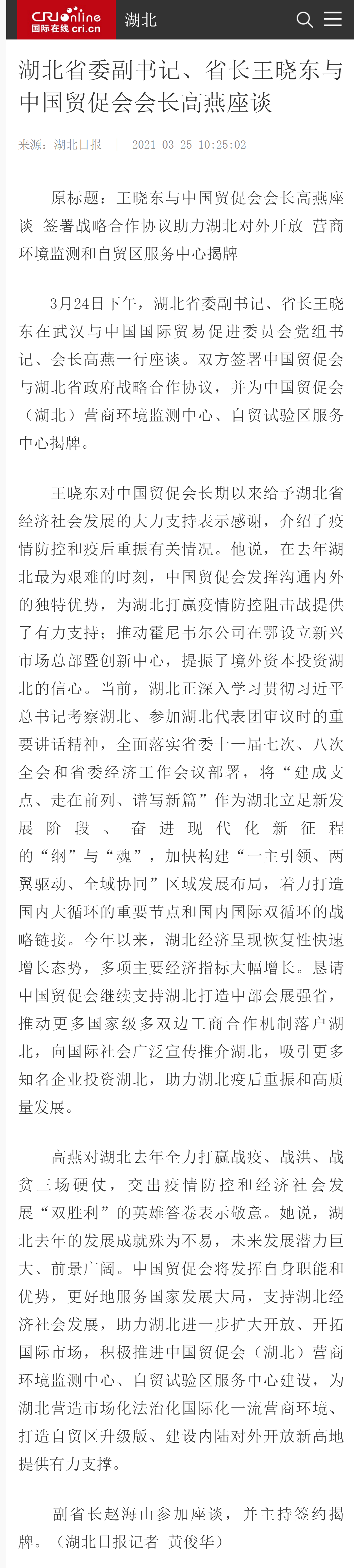 中央广电总台国际在线:湖北省委副书记、省长王晓东与中国贸促会会长高燕座谈