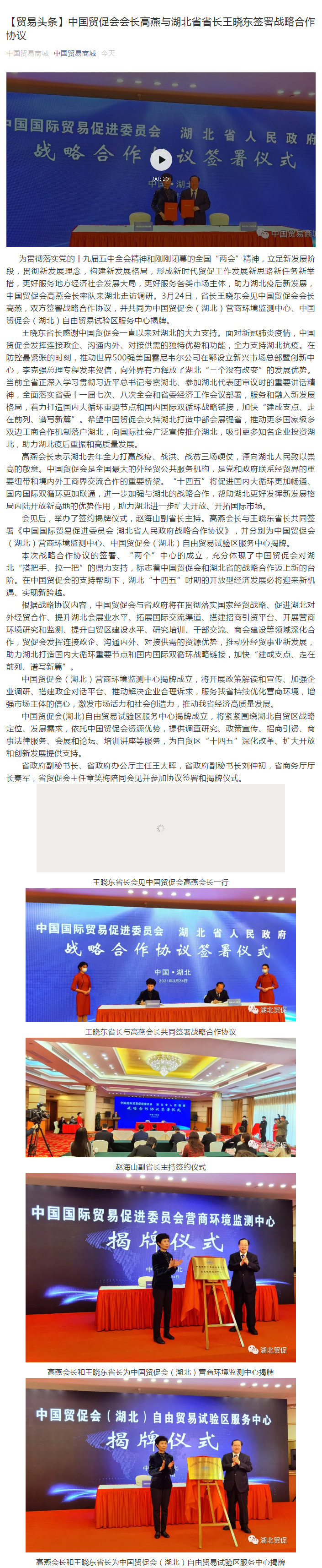中国贸易商城:【贸易头条】中国贸促会会长高燕与湖北省省长王晓东签署战略合作协议