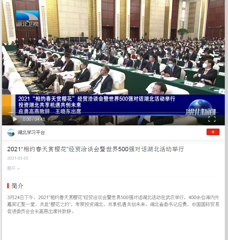 学习强国:2021“相约春天赏樱花”经贸洽谈会暨世界500强对话湖北活动举行