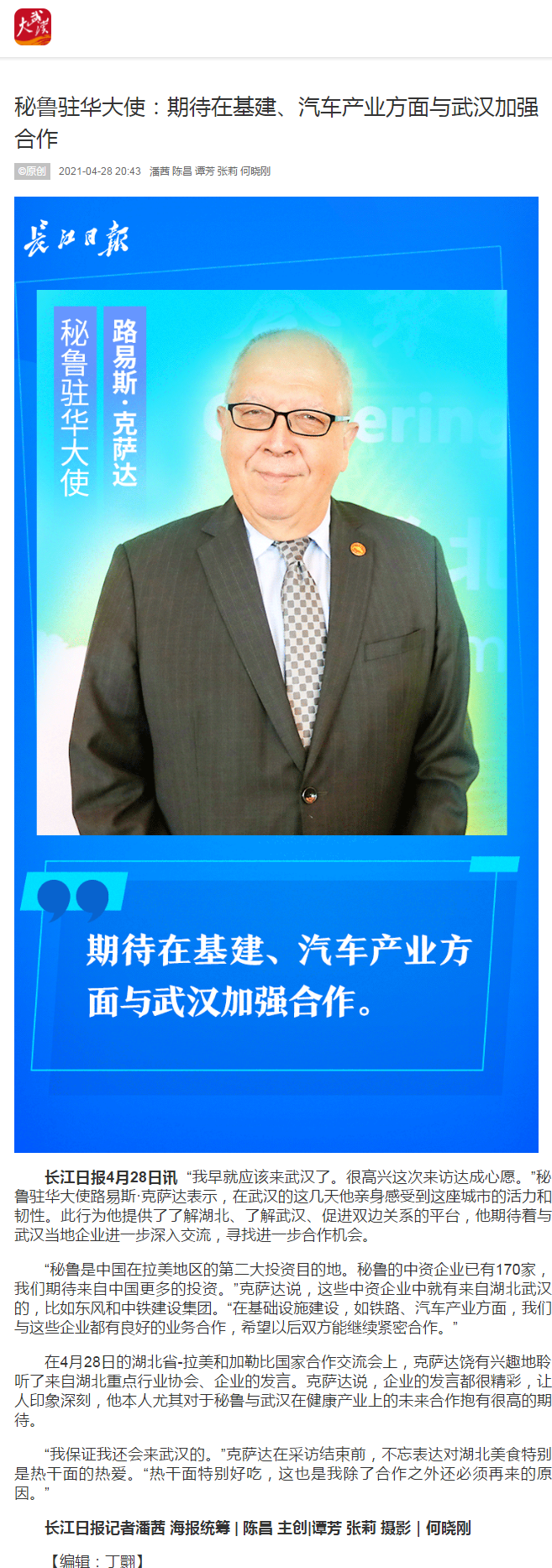 长江日报:秘鲁驻华大使:期待在基建、汽车产业方面与武汉加强合作