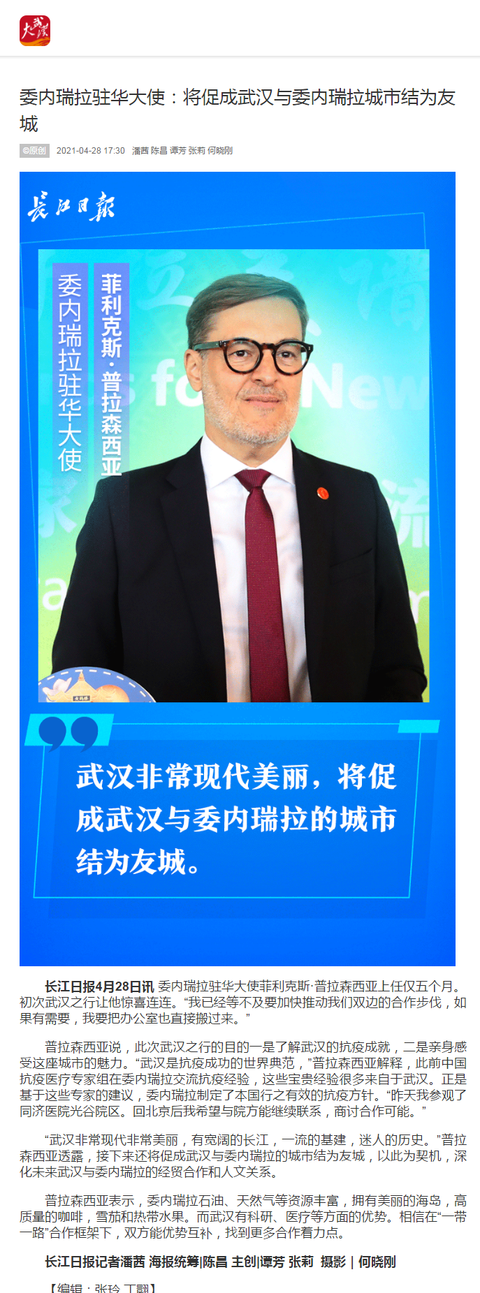 长江日报:委内瑞拉驻华大使:将促成武汉与委内瑞拉城市结为友城