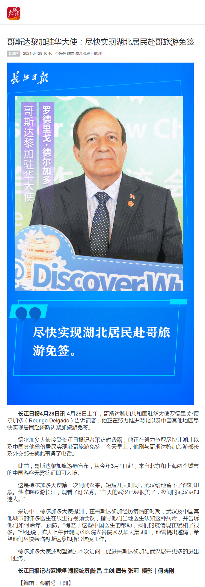 长江日报:哥斯达黎加驻华大使:尽快实现湖北居民赴哥旅游免签