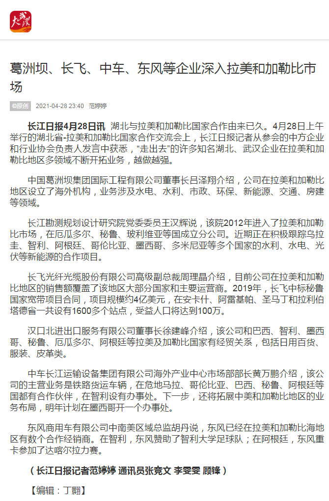 长江日报:葛洲坝、长飞、中车、东风等企业深入拉美和加勒比市场
