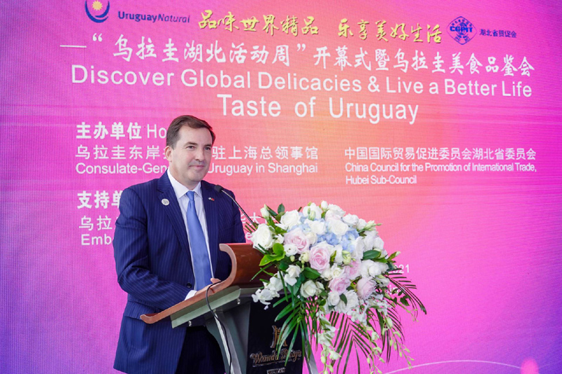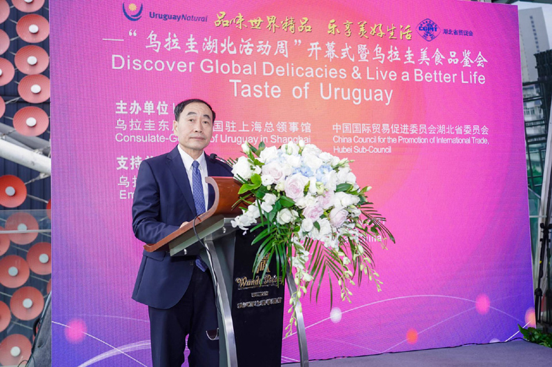 5月26日,由乌拉圭驻上海总领事馆和湖北省贸促会共同主办的“品味世界精品 乐享美好生活”——“乌拉圭湖北活动周”开幕式暨乌拉圭美食品鉴会在汉成功举行。湖北省人民政府副省长赵海山,乌拉圭驻华大使费尔南多•卢格里斯出席活动并致辞。乌拉圭总统府国际合作署,乌拉圭里维拉省、萨尔托省省长纷纷发表视频致辞。乌拉圭驻上海总领事莱昂纳多•奥利维拉•德•安德烈,乌拉圭肉类、乳制品、葡萄酒等行业协会和龙头企业代表,湖北省政府副秘书长刘仲初、有关省直部门和高校负责人,外国驻汉总领馆、驻鄂商协会以及来自商超、餐饮、酒店、进出口、烘焙、乳业、葡萄酒等行业的70多家企业近300人参加活动。