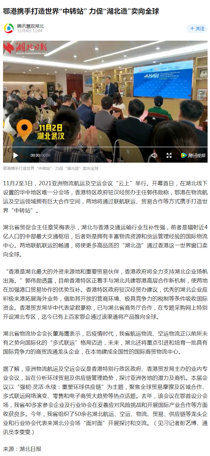 腾讯网:鄂港携手打造世界“中转站” 力促“湖北造”卖向全球