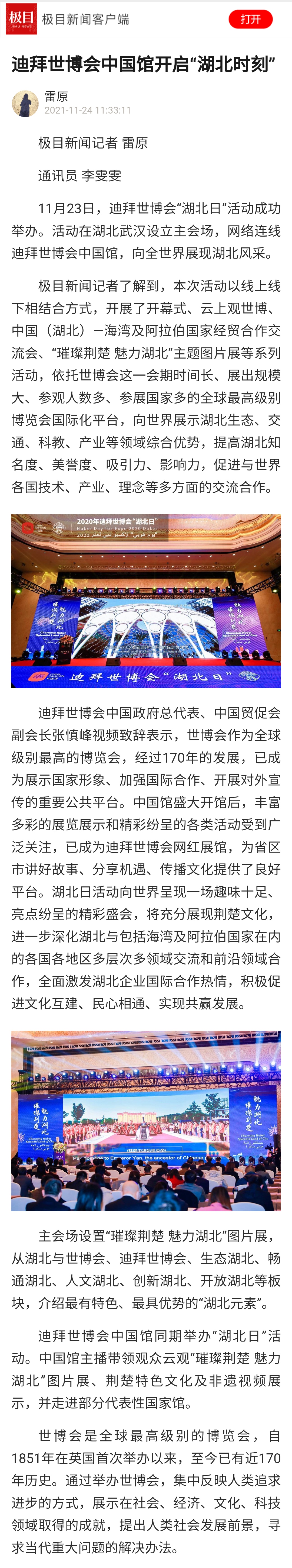 楚天都市报:迪拜世博会中国馆开启“湖北时刻”