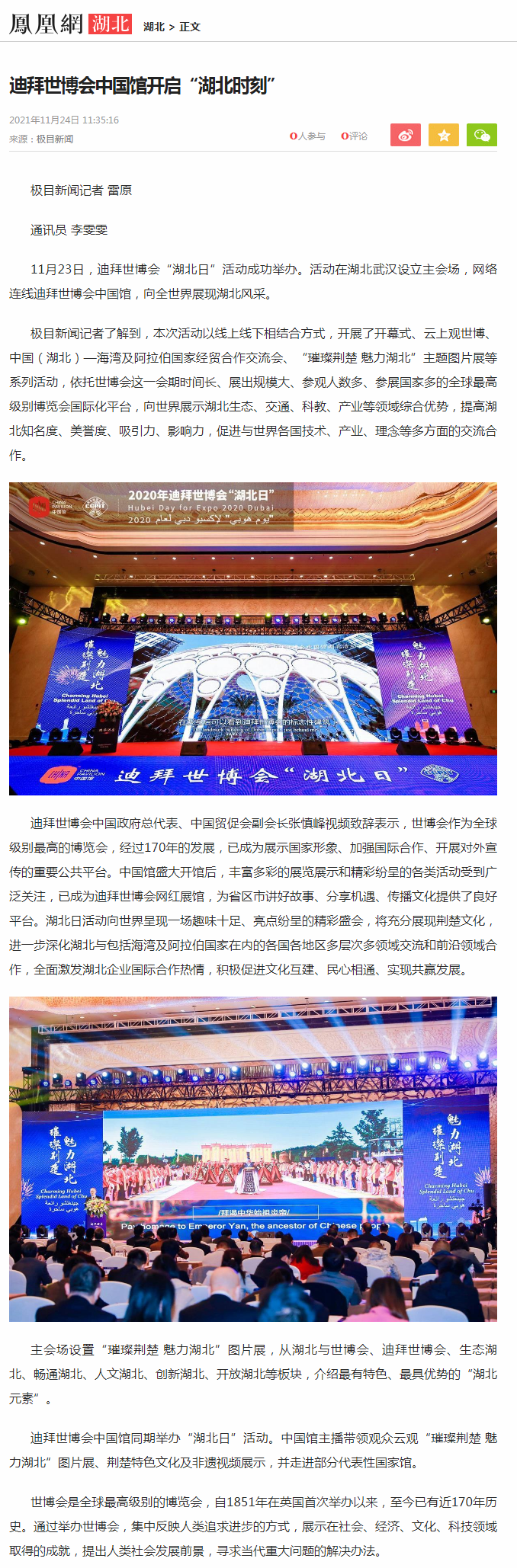 凤凰网:迪拜世博会中国馆开启“湖北时刻”