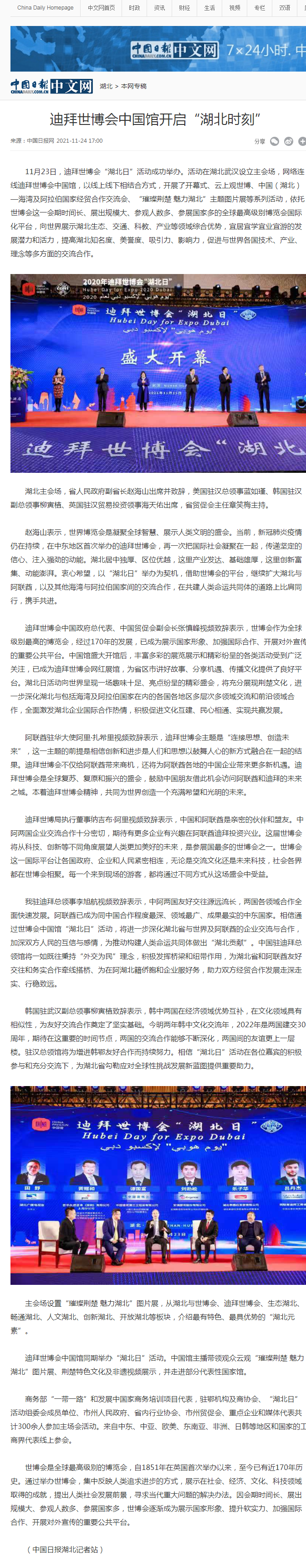 中国日报:迪拜世博会中国馆开启“湖北时刻”