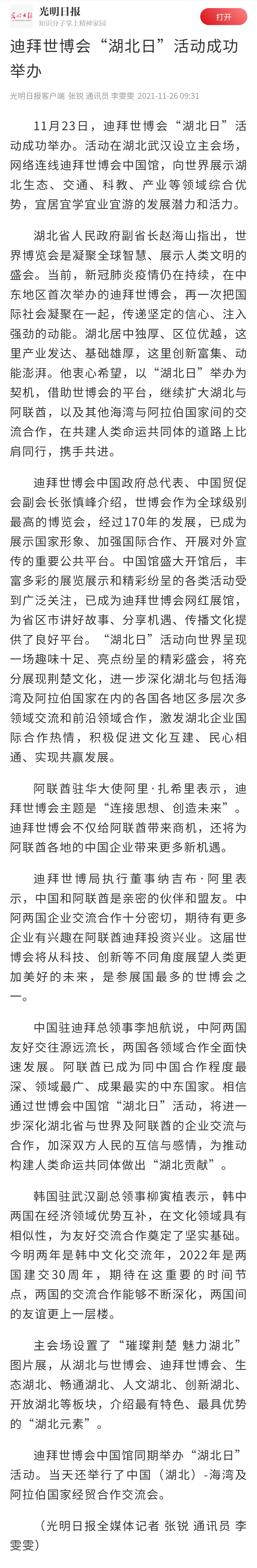 光明日报:迪拜世博会“湖北日”活动成功举办