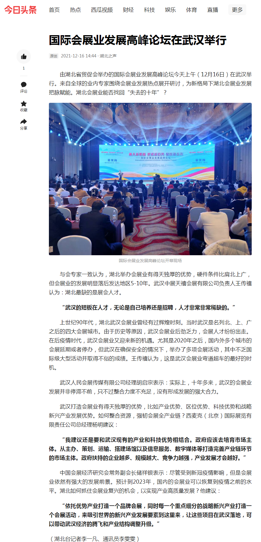 湖北之声:国际会展业发展高峰论坛在武汉举行
