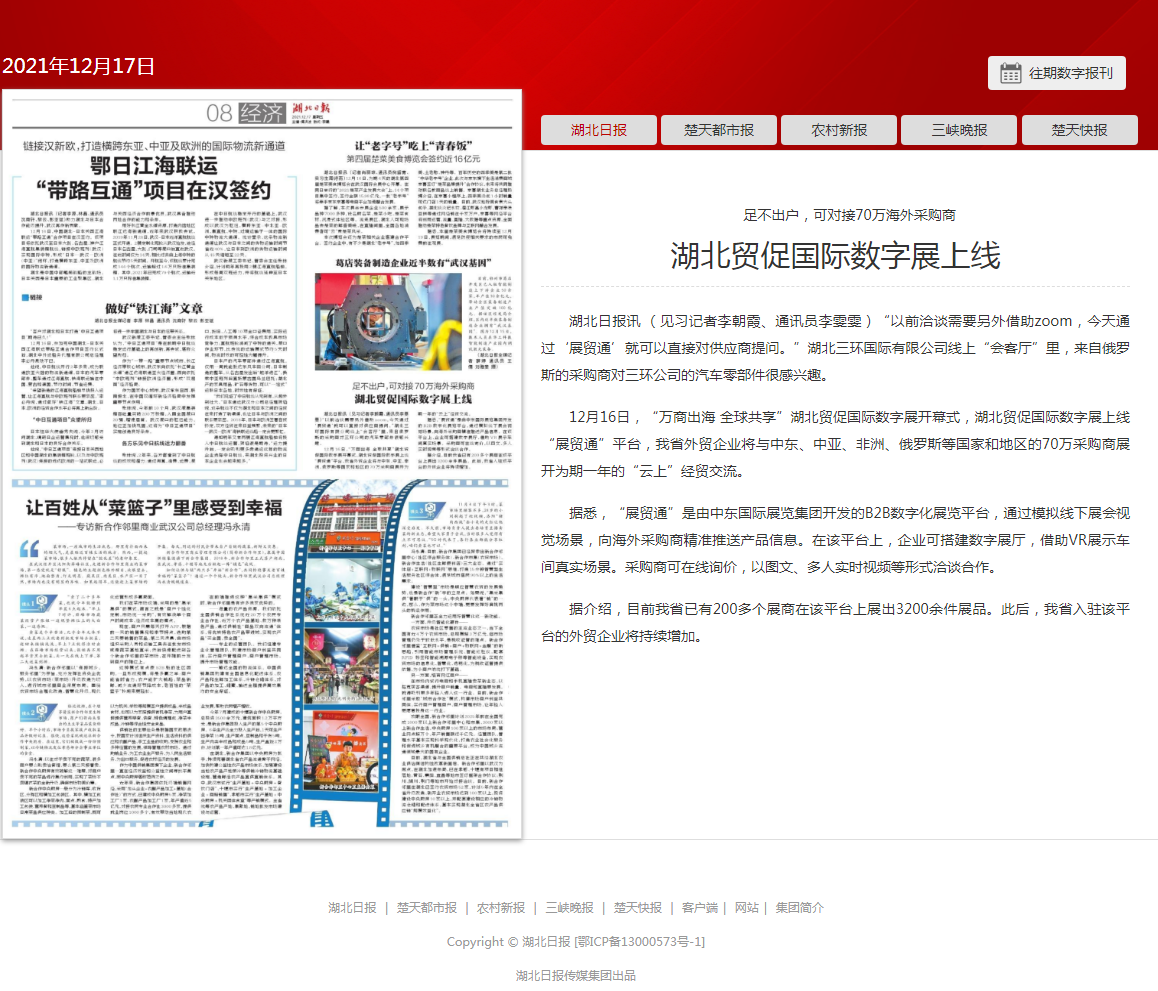 湖北日报:足不出户,可对接70万海外采购商 湖北贸促国际数字展上线