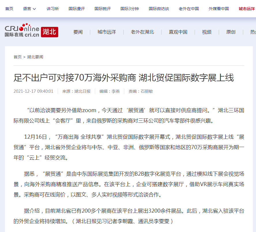 中央广电总台国际在线:足不出户可对接70万海外采购商 湖北贸促国际数字展上线