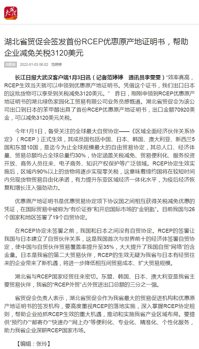 长江日报:湖北省贸促会签发首份RCEP优惠原产地证明书,帮助企业减免关税3120美元