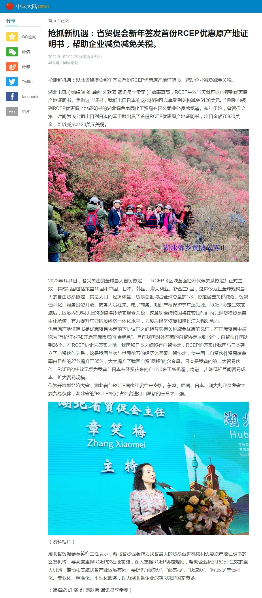 国际湖北:抢抓新机遇:省贸促会新年签发首份RCEP优惠原产地证明书,帮助企业减负减免关税