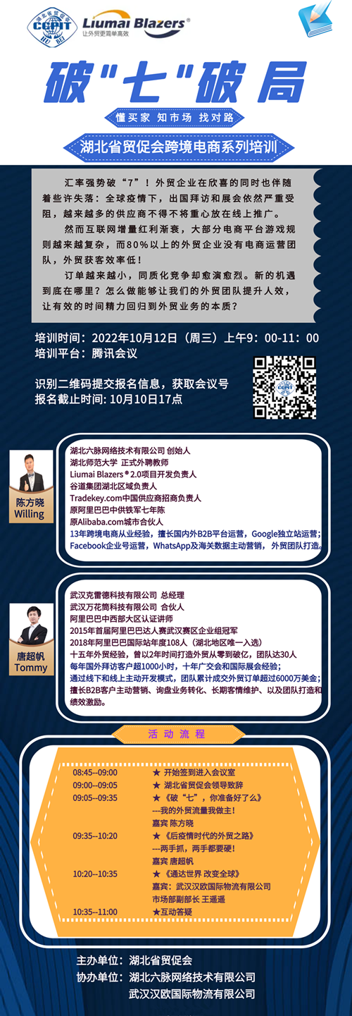 根据总体安排,将于10月12日(周三)上午举办第一期线上培训,围绕后疫情时代复杂国际经济形势下如何懂买家、知市场、找对路,邀请有丰富经验的跨境电商从业者以及成功企业代表分享思路、传授经验。具体信息如下: