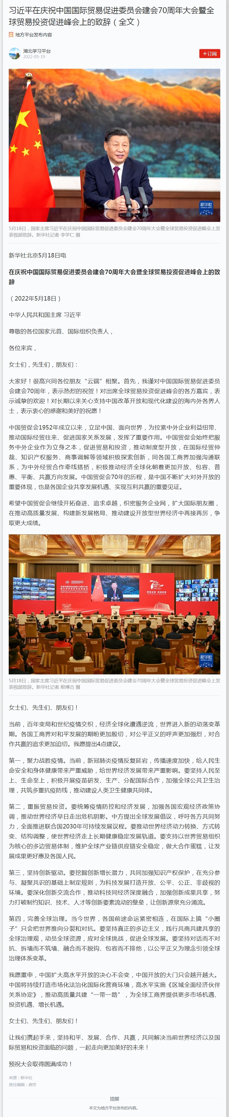 学习强国:习近平在庆祝中国国际贸易促进委员会建会70周年大会暨全球贸易投资促进峰会上的致辞(全文)