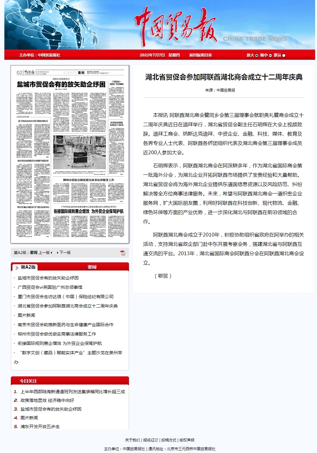 中国贸易报:湖北省贸促会参加阿联酋湖北商会成立十二周年庆典