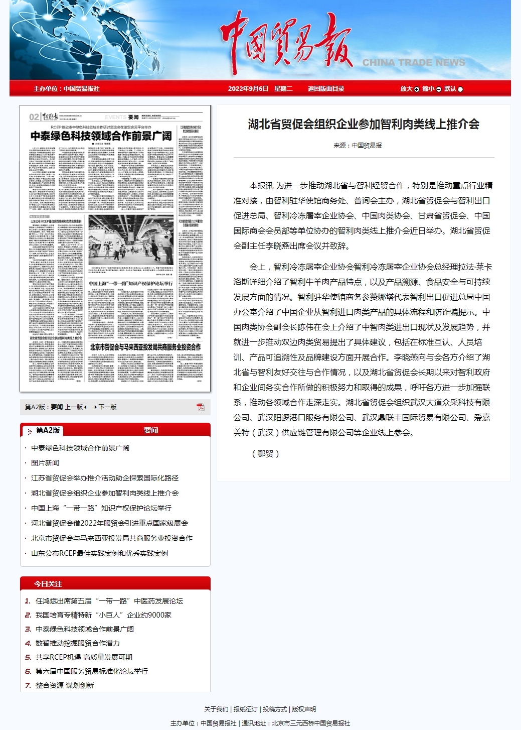 中国贸易报:湖北省贸促会组织企业参加智利肉类线上推介会