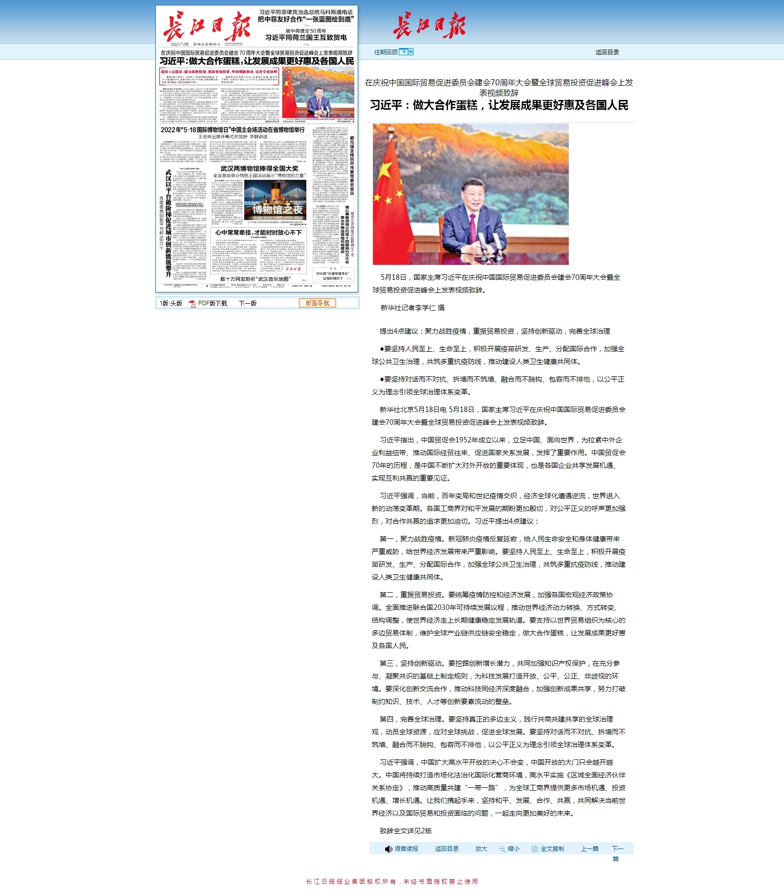 长江日报:在庆祝中国国际贸易促进委员会建会70周年大会暨全球贸易投资促进峰会上发表视频致辞 习近平:做大合作蛋糕,让发展成果更好惠及各国人民