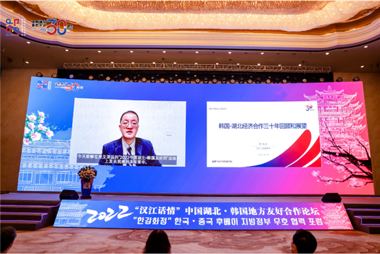 为纪念中韩建交30周年,回顾两国建交以来我省与韩国友好交往合作历程,进一步深化湖北与韩国友好交往与务实合作,11月17上午,由湖北省人民政府和韩国驻武汉总领馆共同主办的“2022中国湖北·韩国友好周”活动在武汉开幕。韩国驻华大使郑在浩、中国驻韩国大使邢海明、韩国国会议员朴钉线上出席开幕式并发表视频致辞,湖北省副省长赵海山、韩国驻武汉总领事姜承锡出席活动并致辞。