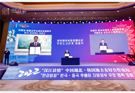 我会承办的“汉江话情”中国湖北·韩国地方友好合作论坛是本次“韩国周”最重要经贸专题活动之一。在合作论坛上,特邀韩国对外经济政策研究院北京事务所首席代表李尚勋、天津大学中国绿色发展研究院高级研究员韩承勋博士、中韩(武汉)石油化工有限公司副总经理张硕元、格林美股份有限公司副总经理张宇平、湖北省社科院研究员傅智能等嘉宾,围绕中韩合作新机遇、鄂韩三十年经济合作回顾和展望、新能源产业合作及韩资企业在鄂发展经验等进行分享交流。荆州市政府副市长李敢、韩国忠清北道驻上海代表处首席代表南吉祐、韩国龟尾市政府驻中国首席代表施炳渊分别进行了道情、市情推介。荆州洪湖市与韩国全罗北道扶安郡线上签署了缔结友城关系协议,正式结为友好城市,这也是湖北省与韩国结交的第9对友好城市。