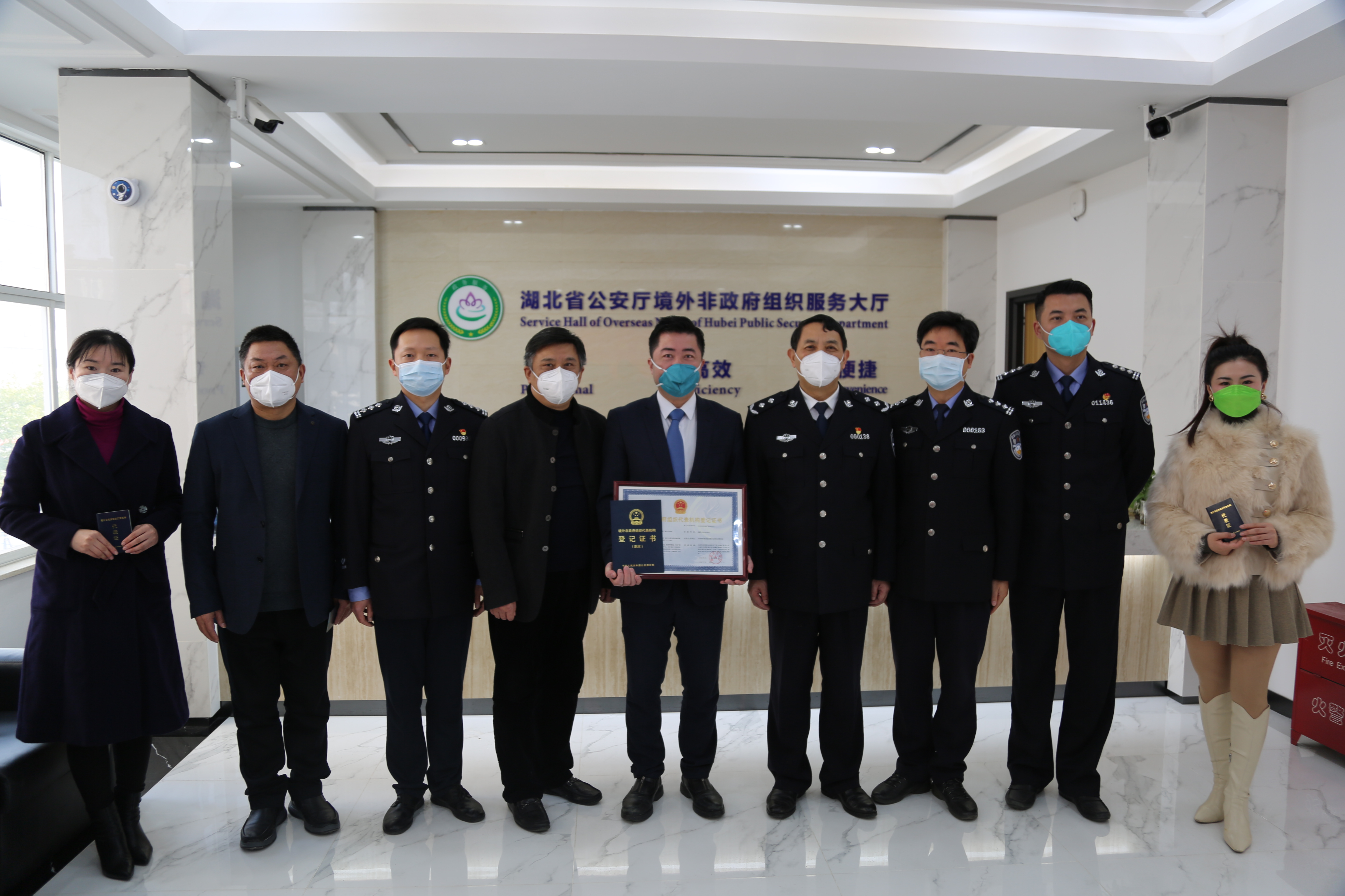 1月6日上午10时,欧洲湖北商会(法国)湖北代表处颁证仪式在省公安厅境外非政府组织服务大厅举行,我会作为业务主管单位应邀出席并致贺词。省公安厅境外非政府组织管理办公室主任徐杰与我会二级巡视员王勇为代表处颁发了境外非政府组织代表机构登记证书和首席代表证、代表证。