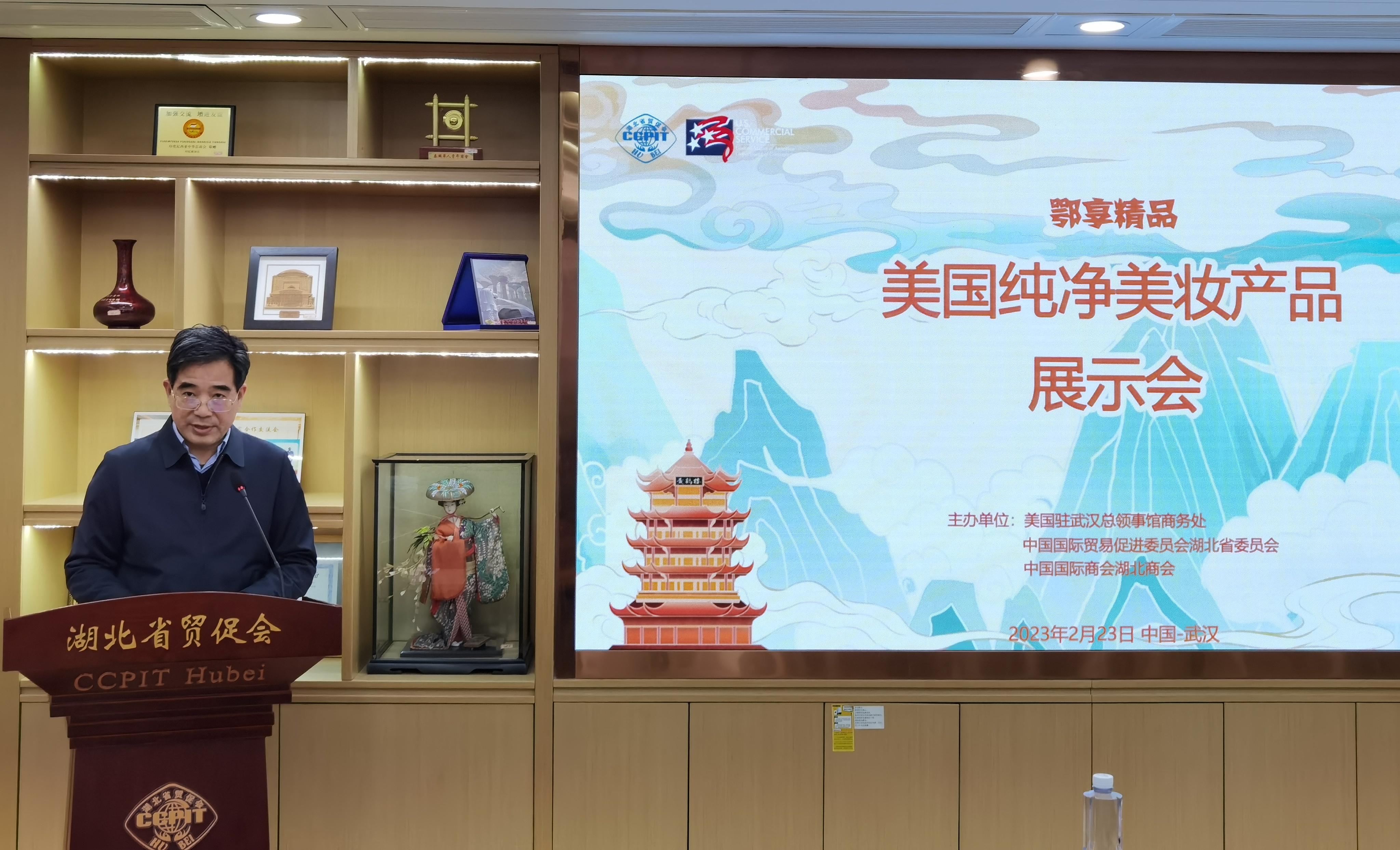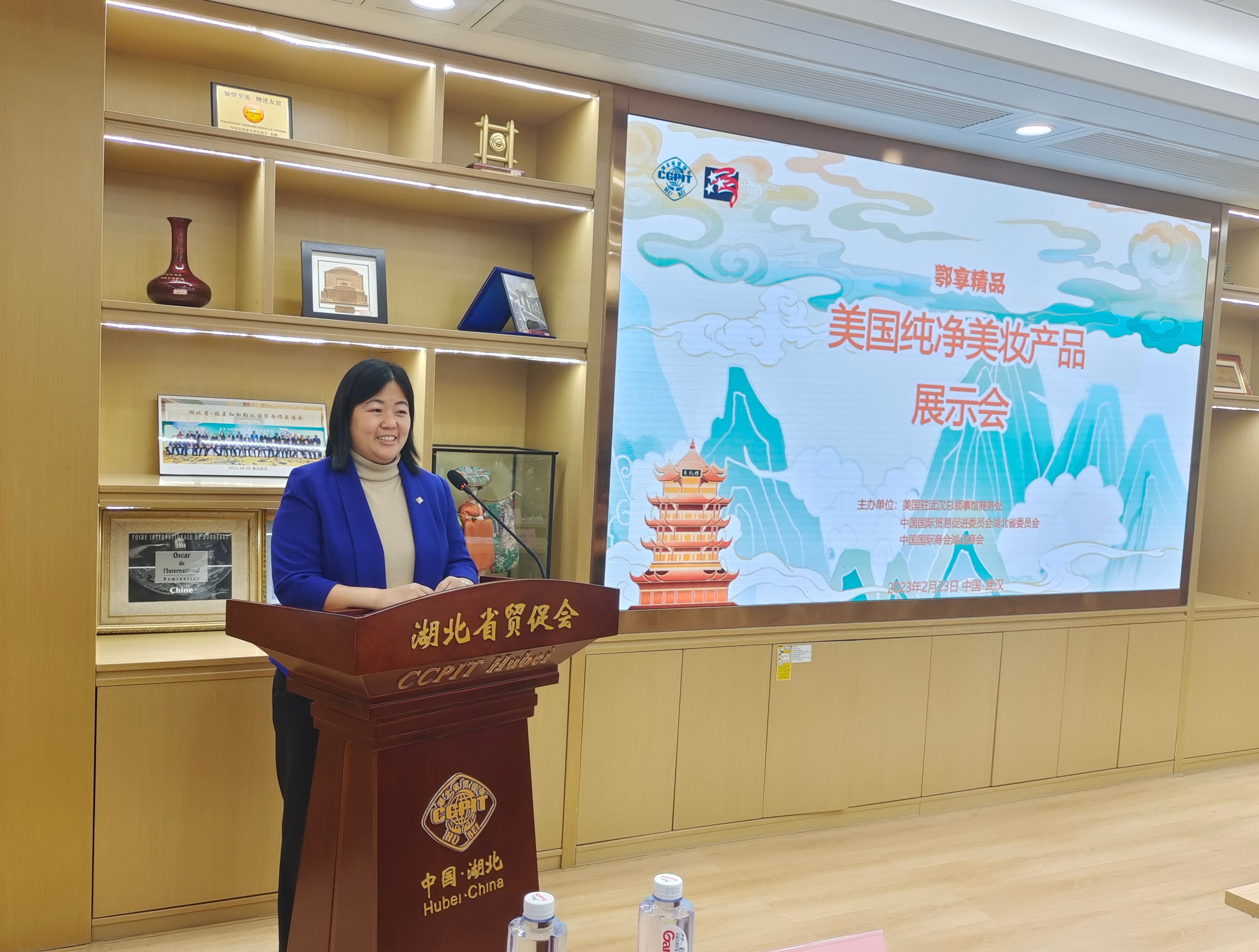 2月23日下午,鄂享精品--美国纯净美妆展示会在武汉成功举办。我会胡中海主任和美国驻汉总领事馆蓝如瑾总领事出席活动并致辞,来自42家商协会、跨境电商、外贸公司、流通企业及媒体代表约60人参会,现场展示了首次亮相中国的25家美国纯净美妆企业60余类美妆产品。