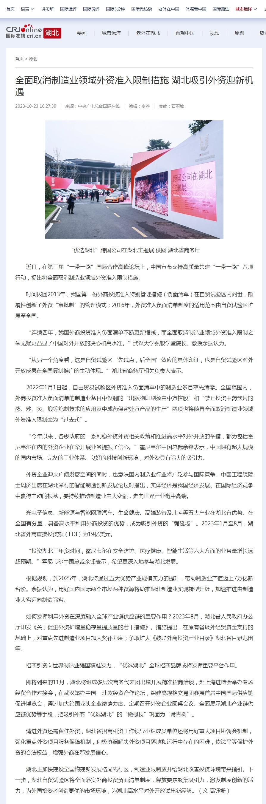 中央广电总台国际在线:全面取消制造业领域外资准入限制措施 湖北吸引外资迎新机遇