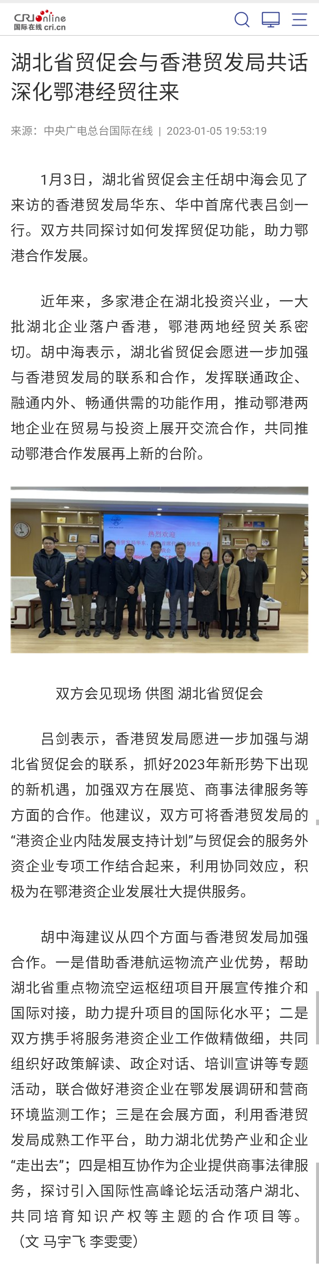 中央广电总台国际在线:湖北省贸促会与香港贸发局共话深化鄂港经贸往来