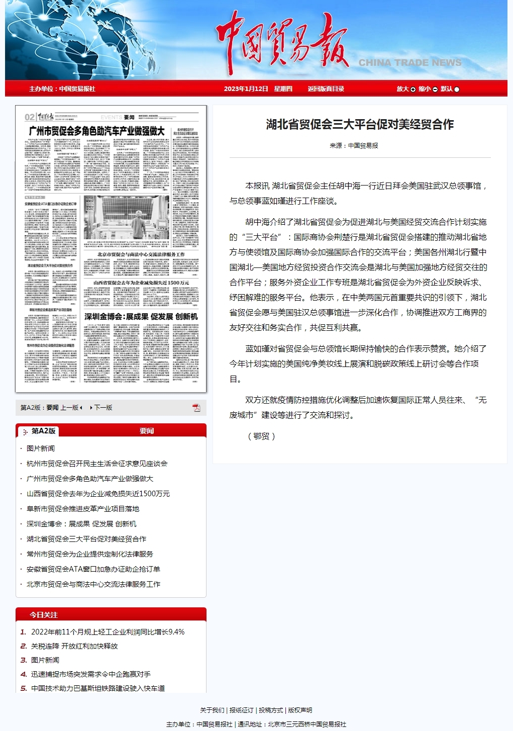 中国贸易报:湖北省贸促会三大平台促对美经贸合作