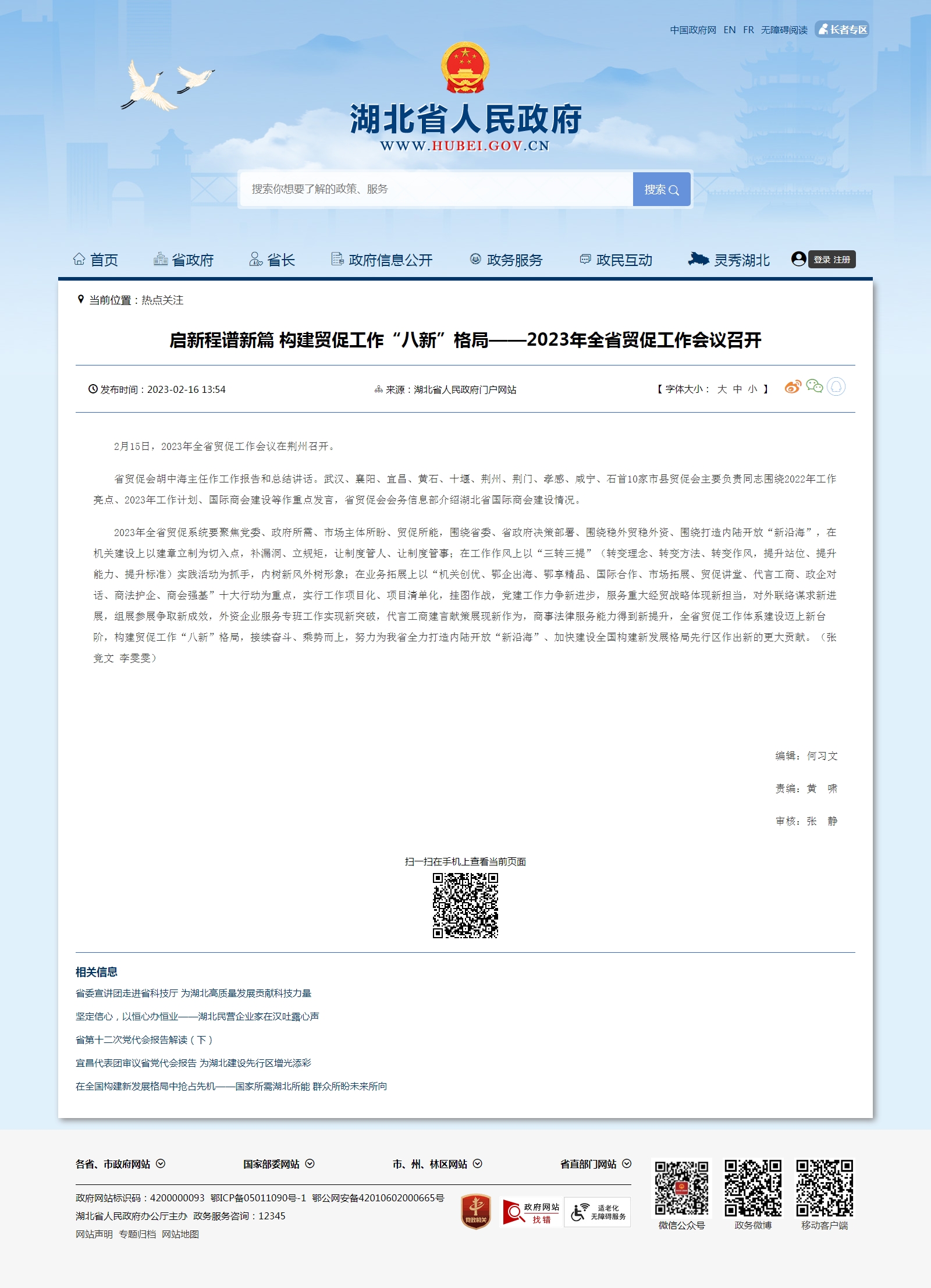 湖北省人民政府门户网:启新程谱新篇 构建贸促工作“八新”格局——2023年全省贸促工作会议召开
